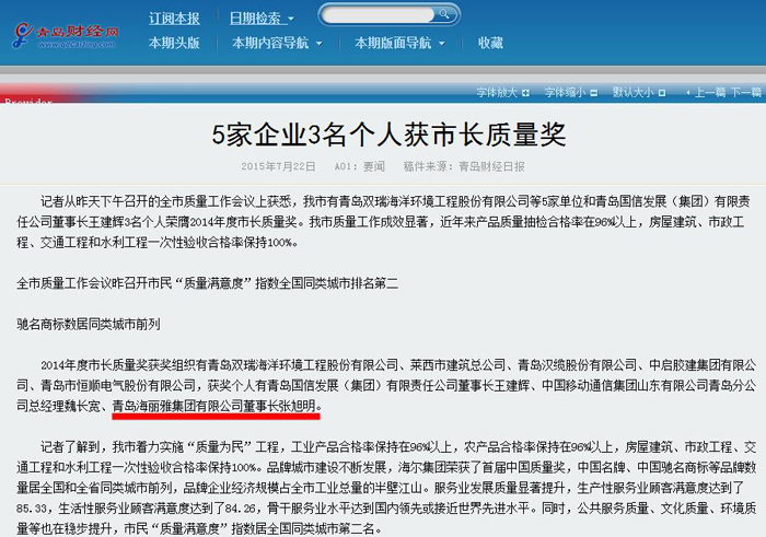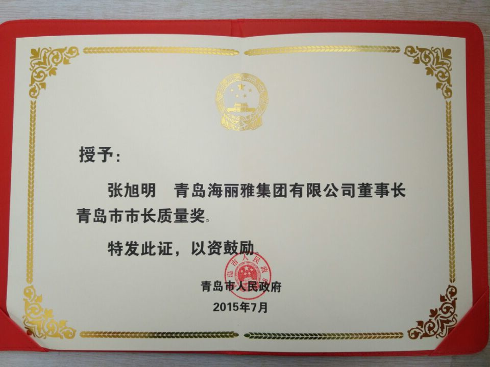 2015年7月21日,青島市人民政府辦公廳召開全市質量工作會議,對2014年度青島市市長質量獎獲獎組織和個人進行表彰。青島海麗雅集團董事長張旭明在全市參評中,經過層層評定,榮獲市長質量獎個人獎。
