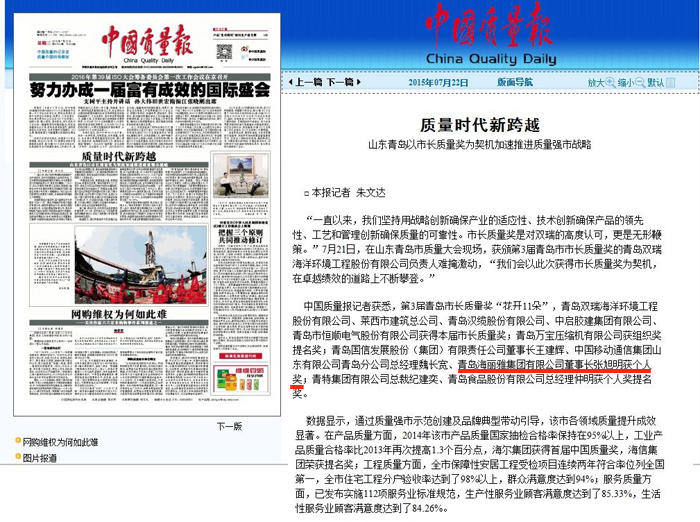 在《5家企業3名個人獲市長質量獎》中對2014年度青島市市長質量獎獲獎情況進行報道,同時指出青島市質量工作成效顯著,房屋建筑,市政工程、交通工程和水利工程一次性驗收合格率保持100%。“質量滿意度”指數全國同類城市排名第一,馳名商標數居同類城市前列。