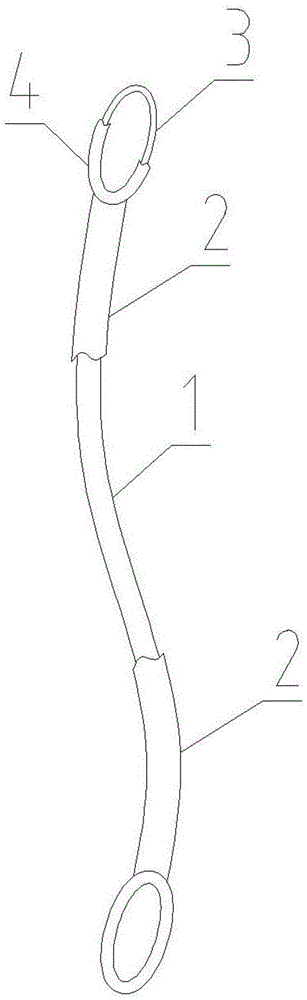 具體的生產時,先將很長的一整條芳綸繩擠塑聚氨酯,然后根據使用要求,截取適合的長度,將兩端聚氨酯層去掉,再在芳綸繩的兩端插接環眼3,然后將聚氨酯層外面露著的芳綸繩和環眼3涂上聚脲樹脂4。