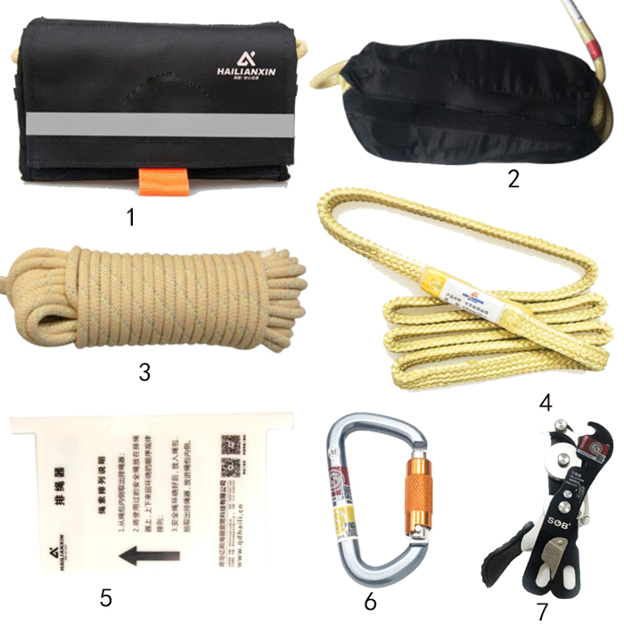 8毫米自救安全繩套裝由多功能繩包、8mm耐高溫自救安全繩16m、輕型安全鉤、可調(diào)節(jié)下降器一個(gè)、6.8mm中空連接扁繩一條和排繩器一個(gè)組成。