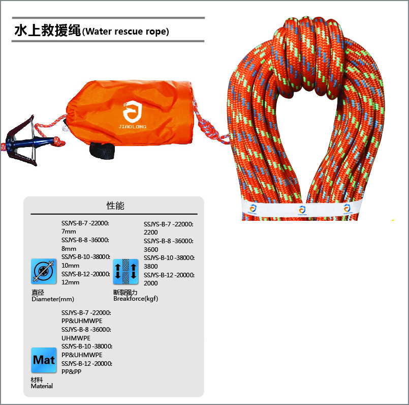 革新性繩皮編制方式,在激流演習項目中保證更牢靠的抓握。質量輕便,可漂浮于水面,繩體用鮮艷的橘紅色或橘黃色亮色系為主,具有反光和夜光功能,在危險時刻容易辨識,為生命保駕護航。可選用丙綸、超高分子量聚乙烯等不同材料,通過先進的生產工藝實現繩索的高強度、易識別、可漂浮等。廣泛應用于水上訓練、救生救援、探險溯溪、浮潛等領域。
