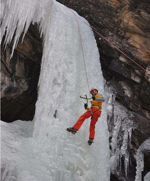 圖為:公司研發生產的“蛟龍”登山繩助力“雪山之吻”登山隊征服水簾洞冰壁