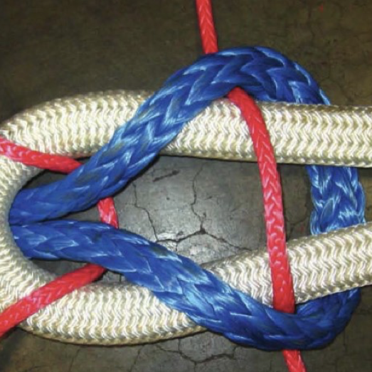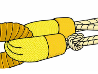 纜繩尾可以使用雙合結直接連接到高模量合成纖維纜繩上。雙合結是一種不使用連接裝置而將兩根纖維繩連接起來的方法。使用后的雙合結可能會變得非常緊,建議在雙合結中加入一段繩頭,有助于將纜繩尾和主纜分開,以便進行更換或檢查。大多數繩頭是由直徑較小的傳統纖維繩做的。